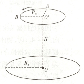 7. [2025·山东卷,10T,4分](多选)如图所示,在无人机的某次定点投放性能测试中,目标区域是水平地面上以$O$点为圆心、半径$R_1 = 5 m$的圆形区域,$OO^\prime$垂直地面,无人机在离地面高度$H = 20 m$的空中绕$O^\prime$点、平行地面做半径$R_2 = 3 m$的匀速圆周运动,$A$、$B$为圆周上的两点,$\angle AO^\prime B = 90°$。若物品相对无人机无初速度地释放,为保证落点在目标区域内,无人机做圆周运动的最大角速度应为$\omega_{\max}$。当无人机以$\omega_{\max}$沿圆周运动经过$A$点时,相对无人机无初速度地释放物品。不计空气对物品运动的影响,物品可视为质点且落地后即静止,重力加速度大小$g = 10 m/s^2$。下列说法正确的是