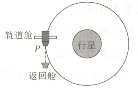 6. [2025·山东卷,6T,3分] 轨道舱与返回舱的组合体,绕质量为 $M$ 的行星做半径为 $r$ 的圆周运动,轨道舱与返回舱的质量比为5:1。如图所示,轨道舱在 $P$ 点沿运动方向向前弹射返回舱,分开瞬间返回舱相对行星的速度大小为 $2 \sqrt{\frac{GM}{r}}$,$G$ 为引力常量,此时轨道舱相对行星的速度大小为