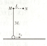 6. [2025·安徽卷,14T,14分] 如图,$M$、$N$为固定在竖直平面内同一高度的两根细钉,间距$L = 0.5 m$。一根长为$3L$的轻绳一端系在$M$上,另一端竖直悬挂质量$m = 0.1 kg$的小球,小球与水平地面接触但无压力。$t = 0$时,小球以水平向右的初速度$v_0 = 10 m/s$开始在竖直平面内做圆周运动。小球牵引着绳子绕过$N$、$M$,运动到$M$正下方与$M$相距$L$的位置时,绳子刚好被拉断,小球开始做平抛运动。小球可视为质点,绳子不可伸长,不计空气阻力,重力加速度$g$取$10 m/s^2$。