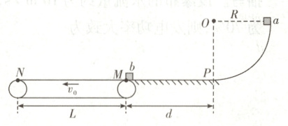 9. [2024·贵州卷,15T,19分] 如图,半径为$R = 1.8\ m$的四分之一光滑圆轨道固定在竖直平面内,其末端与水平地面$PM$相切于$P$点,$PM$的长度$d = 2.7\ m$。一长为$L = 3.3\ m$的水平传送带以恒定速率$v_0 = 1\ m/s$逆时针转动,其右端与地面在$M$点无缝对接。物块$a$从圆轨道顶端由静止释放,沿轨道下滑至$P$点,再向左做直线运动至$M$点与静止的物块$b$发生弹性正碰,碰撞时间极短。碰撞后$b$向左运动到达传送带的左端$N$时,瞬间给$b$一水平向右的冲量$I$,其大小为$6\ N· s$。以后每隔$\Delta t = 0.6\ s$给$b$一相同的瞬时冲量$I$,直到$b$离开传送带。已知$a$的质量为$m_a = 1\ kg$,$b$的质量为$m_b = 2\ kg$,它们均可视为质点。$a$、$b$与地面及传送带间的动摩擦因数均为$\mu = 0.5$,取重力加速度大小$g = 10\ m/s^2$。求: