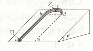7. [2025·四川卷,15T,16分] 如图所示,倾角为$\theta$的斜面固定于水平地面,斜面上固定有半径为$R$的半圆挡板和长为$7R$的直挡板。$a$为直挡板下端点,$bd$为半圆挡板直径且沿水平方向,$c$为半圆挡板最高点,两挡板相切于$b$点,$de$与$ab$平行且等长。小球乙被锁定在$c$点。小球甲从$a$点以一定初速度出发,沿挡板运动到$c$点与小球乙发生完全弹性碰撞,碰撞前瞬间解除对小球乙的锁定,小球乙在此后的运动过程中无其他碰撞。小球甲质量为$m_1$,两小球均可视为质点,不计一切摩擦,重力加速度大小为$g$。
