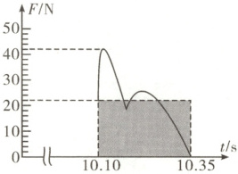 5. [2023·河北卷,6T,4分] 某科研团队通过传感器收集并分析运动数据,为跳高运动员的技术动作改进提供参考。图为跳高运动员在起跳过程中,其单位质量受到地面的竖直方向支持力随时间变化关系曲线。图像中$10.10 s$至$10.35 s$内,曲线下方的面积与阴影部分的面积相等。已知该运动员的质量为$60 kg$,重力加速度$g$取$10 m/s^2$。下列说法正确的是 (