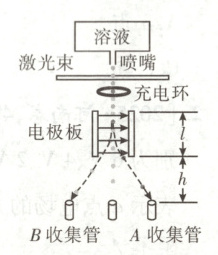 12. [2025·河南卷,13T,10分]流式细胞仪可对不同类型的细胞进行分类收集,其原理如图所示。仅含有一个$A$细胞或$B$细胞的小液滴从喷嘴喷出(另有一些液滴不含细胞),液滴质量均为$m = 2.0 × 10^{-10}\ kg$。当液滴穿过激光束、充电环时被分类充电,使含$A、B$细胞的液滴分别带上正、负电荷,电荷量均为$q = 1.0 × 10^{-13}\ C$。随后,液滴以$v = 2.0\ m/s$的速度竖直进入长度为$l = 2.0 × 10^{-2}\ m$的电极板间,板间电场均匀、方向水平向右,电场强度大小为$E = 2.0 × 10^{5}\ N/C$。含细胞的液滴最终被分别收集在极板下方$h = 0.1\ m$处的$A、B$收集管中。不计重力、空气阻力以及带电液滴间的作用。求: