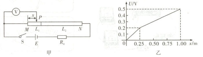 1. [2024·广西卷,6T,4分] 将横截面相同、材料不同的两段导体$L_1$、$L_2$无缝连接成一段导体,总长度为1.00 m,接入图甲电路。闭合开关 S,滑片 P 从 M 端滑到 N 端,理想电压表读数 U 随滑片 P 的滑动距离 x 的变化关系如图乙,则导体$L_1$、$L_2$的电阻率之比约为 (