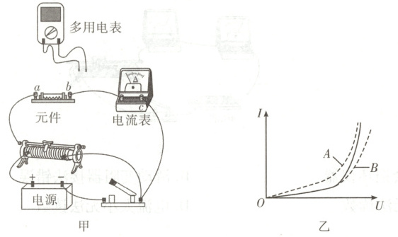 (3)表笔分别接a、b接点时,电压表测量元件两端的电压,表笔分别接a、c接点时,电压表测量元件和电流表两端电压之和,则电流相同时,$U_{ab} < U_{ac}$,则题图乙中B是$I - U_{ac}$曲线。