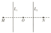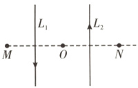 1. [2025·福建卷,3T,4分] 如图所示,空间中存在两根无限长直导线$L_1$与$L_2$,通有大小相等,方向相反的电流。导线周围存在$M$、$O$、$N$三点,$M$与$O$关于$L_1$对称,$O$与$N$关于$L_2$对称且$OM = ON$,初始时,$M$处的磁感应强度大小为$B_1$,$O$点的磁感应强度大小为$B_2$,现保持$L_1$中电流不变,仅将$L_2$撤离,$N$点的磁感应强度大小为