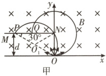 解题思路粒子在磁场中做匀速圆周运动,由洛伦兹力提供向心力有$qvB = m\frac{v^2}{r}$,解得粒子做圆周运动的半径为$r = d$,A错误。如图甲所示,当粒子恰好经过薄板最右端打到薄板上表面时,粒子打到薄板上表面的位置$P$距$N$点最远,当粒子沿$x$轴正方向射出时,粒子打到薄板上表面的位置$Q$距$N$点最近,由几何关系可知,薄板的上表面接收到粒子的区域长度$\Delta x_1 = 2r\cos30^{\circ}-r = (\sqrt{3}-1)d$,B错误。如图乙所示,粒子能打到薄板下表面的最右端,当粒子的运动轨迹与薄板下表面相切时,粒子打到薄板下表面的位置$A$距$N$点最远,由几何关系可知,薄板的下表面接收到粒子的区域长度$\Delta x_2 = d$,C正确。粒子在磁场中运动的周期$T = \frac{2\pi r}{v}=\frac{2\pi m}{qB}$,薄板接收到的粒子在磁场中运动的时间$t = \frac{\theta}{360^{\circ}}T$,则粒子运动轨迹所对圆心角$\theta$越大,运动时间越长,由上述分析可知,打在薄板下表面$N$处的粒子所对应的圆心角最小,为$\theta_{min}=60^{\circ}$,则$t_{min}=\frac{60^{\circ}}{360^{\circ}}×\frac{2\pi m}{qB}=\frac{\pi m}{3qB}$,D错误。