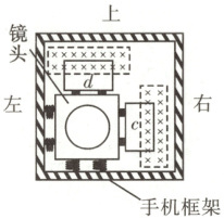 3. [2025·河南卷,9T,6分] (多选)手机拍照时手的抖动产生的微小加速度会影响拍照质量,光学防抖技术可以消除这种影响。如图,镜头仅通过左、下两侧的弹簧与手机框架相连,两个相同线圈$c$、$d$分别固定在镜头右、上两侧,$c$、$d$中的一部分处在相同的匀强磁场中,磁场方向垂直纸面向里。拍照时,手机可实时检测手机框架的微小加速度$a$的大小和方向,依此自动调节$c$、$d$中通入的电流$I_c$和$I_d$的大小和方向(无抖动时$I_c$和$I_d$均为零),使镜头处于零加速度状态。下列说法正确的是