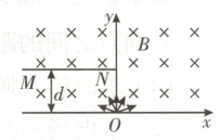 2. [2025·安徽卷,7T,4分] 如图,在竖直平面内的$Oxy$直角坐标系中,$x$轴上方存在垂直纸面向里的匀强磁场,磁感应强度大小为$B$。在第二象限内,垂直纸面且平行于$x$轴放置足够长的探测薄板$MN$,$MN$到$x$轴的距离为$d$,上、下表面均能接收粒子。位于原点$O$的粒子源,沿$Oxy$平面向$x$轴上方各个方向均匀发射相同的带正电粒子。已知粒子所带电荷量为$q$,质量为$m$,速度大小均为$\frac{qBd}{m}$。不计粒子的重力、空气阻力及粒子间的相互作用,则