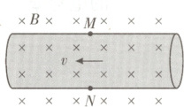 3. [2025·北京卷,12T,3分] 电磁流量计可以测量导电液体的流量$Q$——单位时间内流过管道横截面的液体体积。如图所示,内壁光滑的薄圆管由非磁性导电材料制成,空间有垂直管道轴线的匀强磁场,磁感应强度为$B$。液体充满管道并以速度$v$沿轴线方向流动,圆管壁上的$M$、$N$两点连线为直径,且垂直于磁场方向,$M$、$N$两点的电势差为$U_0$。下列说法错误的是
