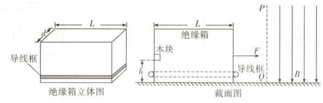 7. [2025·云南卷,15T,15分] 如图所示,光滑水平面上有一个长为L、宽为d的长方体空绝缘箱,其四周紧固一电阻为R的水平矩形导线框,箱子与导线框的总质量为M。与箱子右侧壁平行的磁场边界平面如截面图中虚线PQ所示,边界右侧存在范围足够大的匀强磁场,其磁感应强度大小为B、方向竖直向下。t=0时刻,箱子在水平向右的恒力F(大小未知)作用下由静止开始做匀加速直线运动,这时箱子左侧壁上距离箱底h处、质量为m的木块(视为质点)恰好能与箱子保持相对静止。箱子右侧壁进入磁场瞬间,木块与箱子分离;箱子完全进入磁场前某时刻,木块落到箱子底部,且箱子与木块均不反弹(木块下落过程中与箱子侧壁无碰撞);木块落到箱子底部时即撤去F。运动过程中,箱子右侧壁始终与磁场边界平行,忽略箱壁厚度、箱子形变、导线粗细及空气阻力。木块与箱子内壁间的动摩擦因数为μ,假设最大静摩擦力等于滑动摩擦力,重力加速度为g。