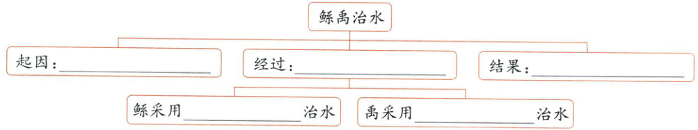 1.起因:洪水泛滥,百姓受苦 经过:鲧和禹治理洪水 息壤 疏导的方法 结果:大禹治服了洪水,人们安居乐业 【解析】短文第1自然段介绍了故事的起因,洪水泛滥,百姓受苦;短文第2~9自然段介绍了鲧和禹治理洪水的过程;最后一个自然段介绍了故事的结果,大禹治服了洪水,人们安居乐业。其中根据第3自然段的描写,可知鲧采用息壤治水,根据第7自然段中“决定用导引洪水流入大海的方法来消除水灾”,可知禹采用疏导的方法来治理洪水。 2.广 长 不易、艰辛 【解析】“由南到北,由西到东”从空间上来说大禹治理洪水的地域广;“十三年”是大禹治理洪水的时间,说明时间之长;“终于”表示经过较长的过程最后出现某种情况,说明治服洪水的过程很艰辛。 3.D 【解析】大禹为治水“三过家门而不入”,一心治理洪水,可见他公而忘私、无私奉献,在治水过程中克服重重困难,经过十三年苦战终于治服洪水,可见他坚韧不拔的特点。运用排除法可知选项D是错误的。 4.鲧 【解析】结合短文内容可知这是在复述鲧治理洪水的经过,对照短文信息,根据“它可以帮助我治理洪水”“我偷出了息壤”“于是派火神祝融来取我性命”等提示性语句,可知这是以鲧的口吻来讲述的。 5.示例:息壤太神奇了,放在地上,说一声“长”,它竟然能伸展开来,赶退洪水。