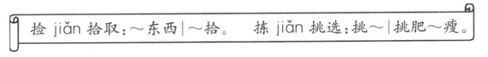 1.捡 拣 【解析】本题考查同音字。“jiǎn 一大袋桂花送给母亲做桂花酒”的意思是拾一大袋桂花送给母亲做桂花酒,因此填“捡”;“jiǎn 一些完整、新鲜的桂花做成书签”的意思是从众多桂花中挑些完整、新鲜的桂花做成书签,所以填“拣”。 2.