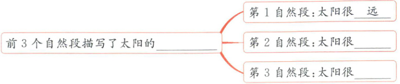 四、特点 大 热 【解析】课文共分两部分,第1~3自然段是第一部分,主要介绍了太阳的特点,其中第1自然段介绍了太阳很远的特点,第2自然段介绍了太阳很大的特点,第3自然段介绍了太阳很热的特点。