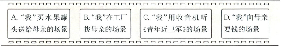 七、1 B 【解析】联系课文内容可知,“我”家境贫寒,母亲挣钱很不容易。虽然“我”买书,母亲愿意给“我”钱,但是“无论要多少钱,她都会给”,这根本就实现不了。因此 B 项理解不恰当。 2 不能。“塞”写出了母亲给“我”钱时的果断,说明母亲很支持“我”读书。“放”无法体现这一点。 【解析】从“塞”这个动作可以感受到母亲给“我”钱时的果断,说明母亲很支持“我”读书。 3 动作 示例:我体会到了文中母亲在争分夺秒地挣钱,工作很辛苦,钱来之不易。 【解析】“说”“坐”“弯曲”“俯”等属于动作描写,四个“立刻”连用,写出了母亲工作时的动作快、节奏快,工作很辛苦,体现了母亲挣钱的不易。