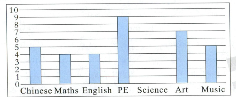 七 跨学科 条形统计图 春雨小学四(1)班统计了同学们最喜爱的学科(每位学生限选一门)。结合条形统计图,完成下列各题。(12分)