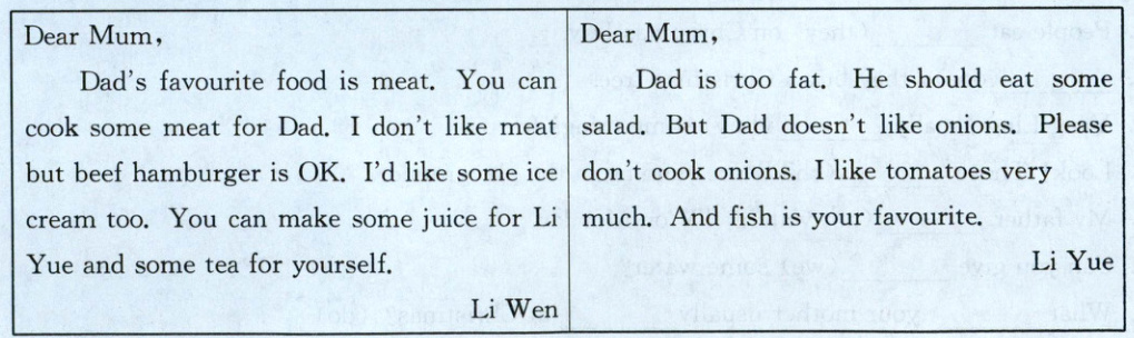 九 新语篇 留言条 在除夕的前一天,李文和李悦两姐妹留言给妈妈,为团圆饭上的食物提建议。阅读留言条,给一家人的餐盘里选择合适的食物。(16分)