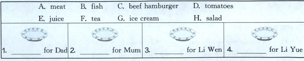 1.由“Dad’s favourite food is meat. You can cook some meat for Dad.”和“He should eat some salad.”可知选A和H。