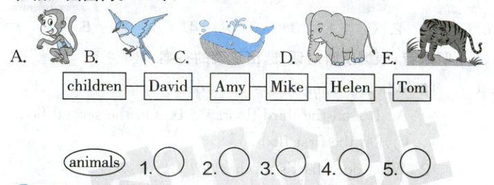 四 新考法 喜好匹配 听录音,选择孩子们喜欢的动物,将序号写在相应圆圈内。(5分)