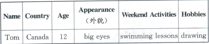 My new friend is Tom. He comes from Canada. He is 12 years old. He is tall and strong. He has two big eyes. He usually has swimming lessons at weekends. He likes drawing. He can draw very well. He is also good at playing football. We sometimes play football after school. I like him very much.