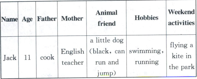 He is 11 years old. His father is a cook. His mother is an English teacher. He has a little dog. It’s black. It can run and jump. It’s very cute. Jack likes swimming and running. He usually goes to the park and flies a kite at weekends.