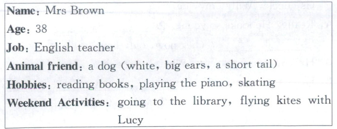 Lucy’s mother is Mrs Brown. She is 38 years old. She is an English teacher. She has an animal friend. It’s a dog. It’s white. It has two big ears and a short tail. She likes reading books and playing the piano. She likes skating too. She often goes to the library at weekends. She sometimes flies kites with Lucy.(答案不唯一)