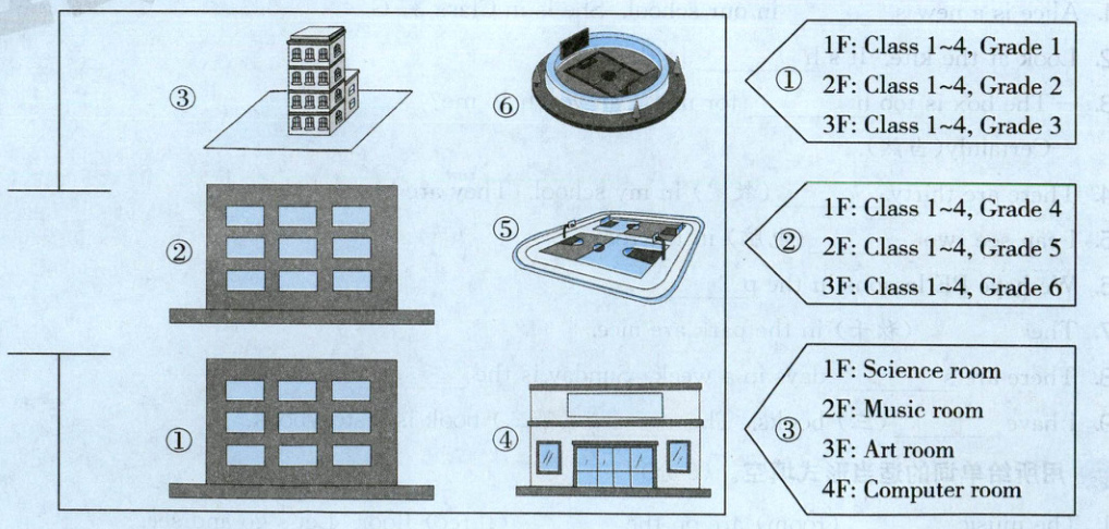 4. 在第一个和第二个教学楼中,每个年级一层,每个年级有4个班,所以一共有24间教室,不是20间,题干与示意图不符,故填F。