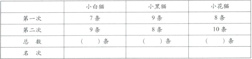三、小猫比赛钓鱼,请你替它们算一算,并给它们排名次。