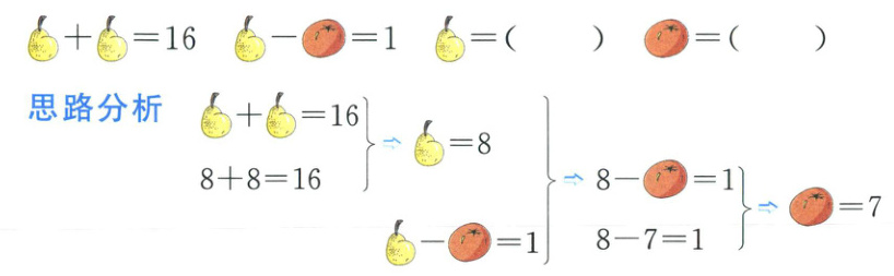 $🍐+🍐=16$,$🍐=$$$8+8 = 16$,$🍐= 8$$8-🍊=1$,$🍊=$$_________$$