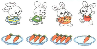 三 每只小兔吃1根胡萝卜,选择哪盘胡萝卜正好够吃?圈一圈。