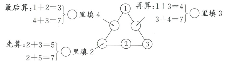 典型例题 在◯里填上合适的数,使每条线上的3个数相加的和都等于7。