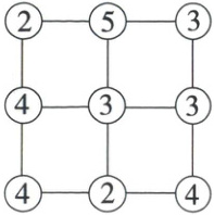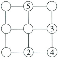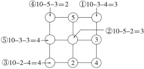 典型例题 在$ ◯ $里填上合适的数,使每一横行、每一竖行上的三个数相加都等于10。
