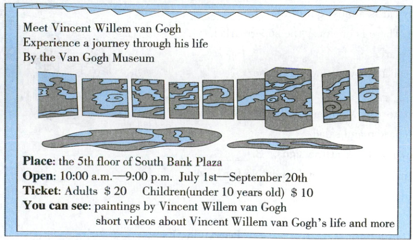 )5. The theme(主题) of the show is .A. Vincent Willem van Gogh’s paintings and life
