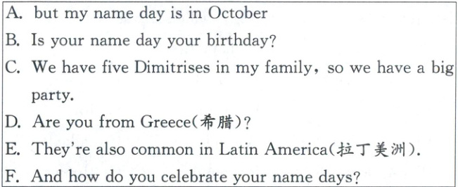 . Everyone with the name Dimitris celebrates in October.TV host: Really? That’s interesting! Are name days common (普遍) all over Europe( 欧洲)?