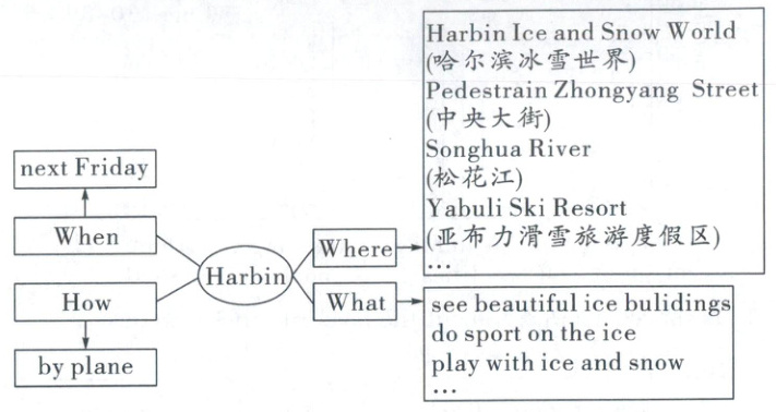 2025 年第九届亚洲冬季运动会在黑龙江省哈尔滨市举办。在寒冷的冬日,这座被誉为“东方小巴黎”的城市迎来了世界各地的游客,迷人的中央大街,世界闻名的冰雪大世界都为这场亚运会的举办增添了无限魅力。Mike 和家人将于寒假期间去欣赏这座美丽的冰城。请根据下面的思维导图,帮 Mike 完成他的假日计划。