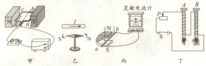 C.图丙闭合电路的部分导体ab在磁场中左右运动,灵敏电流计指针会偏转