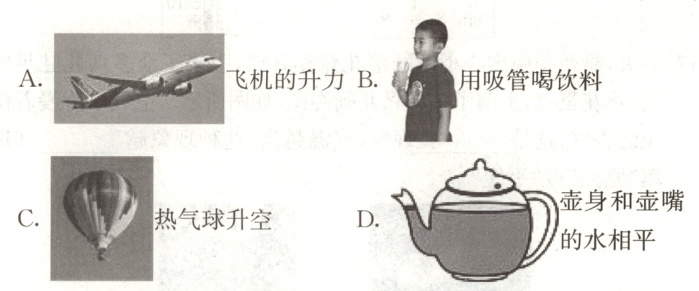 A.飞机的机翼上方空气流速大,压强小;下方空气流速小,压强大;机翼上下方所受到的压力差形成向上的升力,故A正确;B.吸管喝饮料时,是先把吸管内的空气吸走,在外界大气压的作用下,饮料被压进吸管里,故B错误;C.热气球升空,热气球受到的浮力大于重力,故C错误;D.壶身和壶嘴底部相连通,上端开口,壶嘴和壶身在同一高度,倒满水后,液面相平,根据连通器原理可知,壶嘴和壶中的水位相同,水静止时,水面保持相平,故D错误。故选A。