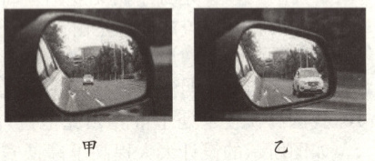 14. 如图甲所示,在向前行驶过程中的轿车司机从后视镜中观察到一辆越野车,下一时刻越野车在后视镜中的位置如图乙所示,则下列说法正确的是(