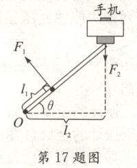 17. 如图所示是使用手机和自拍杆自拍时的示意图。已知自拍杆长1m(质量忽略不计),手机对杆竖直向下的作用力为$F_2$,手垂直于杆的动力为$F_1$。由此可知,此时自拍杆相当于一个