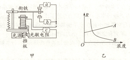 20. 如图甲所示是某车间自动除尘装置的简化电路图。空气中尘埃浓度较少时,光源发出来的光被挡板挡住了。当空气中尘埃浓度达到一定值时,由于尘埃的反射,部分光越过挡板射到光敏电阻上,使电路中的电流增大,在衔铁的作用下,开启自动除尘模式。光敏电阻的阻值随尘埃浓度变化情况符合图乙中的