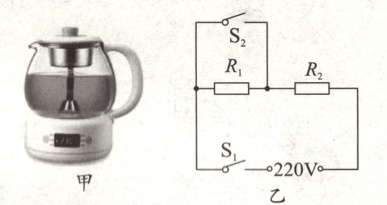 24. 图甲是某加热水壶,其容积为1L,部分参数见表。简化电路如图乙,$S_2$为挡位开关,$R_1$、$R_2$均为发热电阻(阻值不随温度变化),则发热电阻$R_1$的阻值为