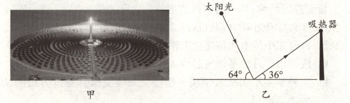 26. (2分)图甲是我国的敦煌塔式光热电站。它由12000面“定日镜”围绕吸热塔组成,每面镜子能追踪太阳并把阳光反射到塔顶的吸热器上。图乙是某个时刻太阳光经某定日镜反射后,照射到吸热器的光路图,请画出该定日镜并标出反射角的大小。