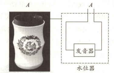 6. 小明同学设计并制作了一个“盲人水杯”,其工作原理如图所示。杯中近杯口处$A$点是水位器的两个金属触点,当杯中的水位达到$A$位置时,水位器会发出音乐声,表示水已盛满。杯口处的两个金属触点的作用相当于 (