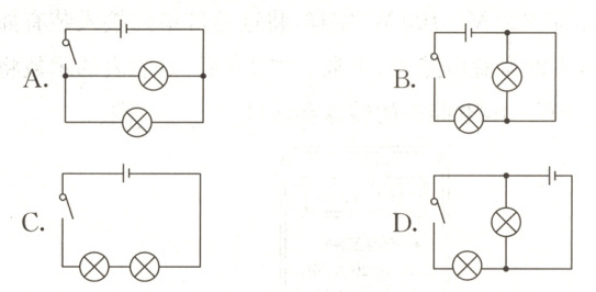 B.图中开关闭合后,右面的那个灯两端用导线直接连接在了一起,导致该灯中没有电流通过,该灯发生短路,故B符合题意;C.图中开关闭合后,电流有一条路径,电路为串联电路,没有短路现象,故C不符合题意;D.图中开关闭合后,电流有两条路径,组成并联电路,没有短路现象,故D不符合题意。故选B。