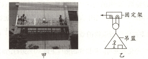 4. 如图甲所示是高空作业的师傅在美化楼体外墙的情境,其结构的原理图如图乙所示,已知吊篮的质量为30 kg,工人以及工具的总重为700 N,绳子自由端的拉力大小为500 N。在电动机拉力的作用下,吊篮在10 s内上升了3 m,不计绳重和摩擦,$ g $取10 N/kg。则下列说法正确的是(
