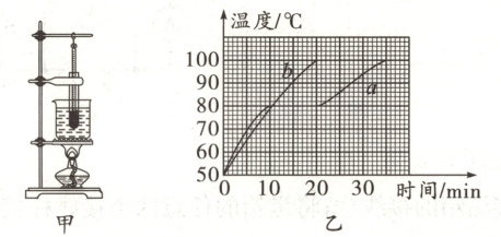 3. 某实验小组用两套如图甲所示完全相同的加热装置探究固体熔化时温度的变化规律,两套装置的烧杯中都装了相同质量的水,试管中分别装有少量相等体积的固体$ a $和固体$ b $。用酒精灯对它们加热,它们的温度随时间变化的图象如图乙所示,则下列说法正确的是(
