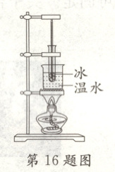 16. 小南利用如图所示的实验装置探究冰的熔化特点。将装有适量碎冰的试管置于烧杯内的温水中,这样做不仅可以使碎冰