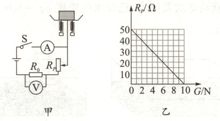 23. (7 分)小孟在实验室设计了一款测量物体重力的装置, 其示意图如图甲所示, 物体放在有弹簧支撑的托盘上, 弹簧底部固定, 该装置可以通过电表示数转换测出重力大小。图乙是滑动变阻器接入电路中的阻值 $R_{P}$与被测物体重力 $G$ 的关系图象。电源电压恒为 $24 \mathrm{~V}$, 定值电阻 $R_{0}$ 为 $30 \Omega$, 电流表的量程为 $0 \sim 0.6 \mathrm{~A}$, 电压表的量程为 $0 \sim 15 \mathrm{~V}$, 滑动变阻器标有“ $50 \Omega 1 \mathrm{~A}$”。