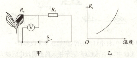 14. 为了从外部检测植物含水量,科学家用石墨烯制成湿敏电阻$R_x$附着在叶片上,电路如图甲所示,其中电源电压恒定,$R_0$为定值电阻,$R_x$的阻值随湿度的变化关系如图乙所示,以下说法正确的是 ()
