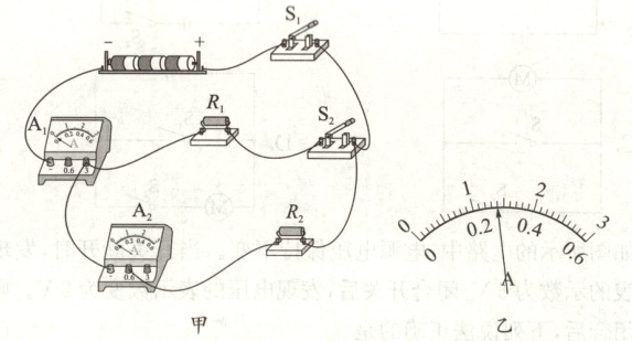 20. 如图甲所示的电路中,当开关$S_1$、$S_2$闭合后,电流表$A_2$测量的是通过的电流,若两只电流表的指针偏转都如图乙所示,则通过$R_1$的电流为$\mathrm{A}$。